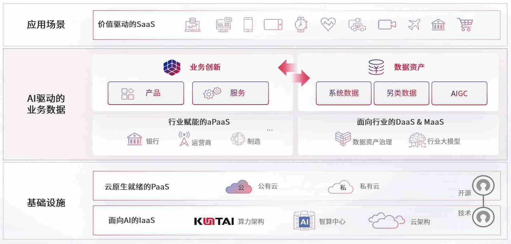 数字时代,,围绕企业数字化转型的关键要素,,,,bob波币钱包数码开创性的提出数云融合战略和技术体系框架,,着力在云原生、、、、数字原生、、AI原生和信创产业上架构产品和服务能力,,为处在不同数字化转型阶段的快消零售、、、、汽车、、、金融、、、医疗、、政企、、、、教育、、、运营商等行业客户提供泛在的敏捷IT能力和融合的数据驱动能力,,,构建跨界融合创新的数字业务场景和新业务模式,,助力企业级客户建立面向未来的核心能力和竞争优势,,全面推动社会的数字化、、智能化转型升级。。。