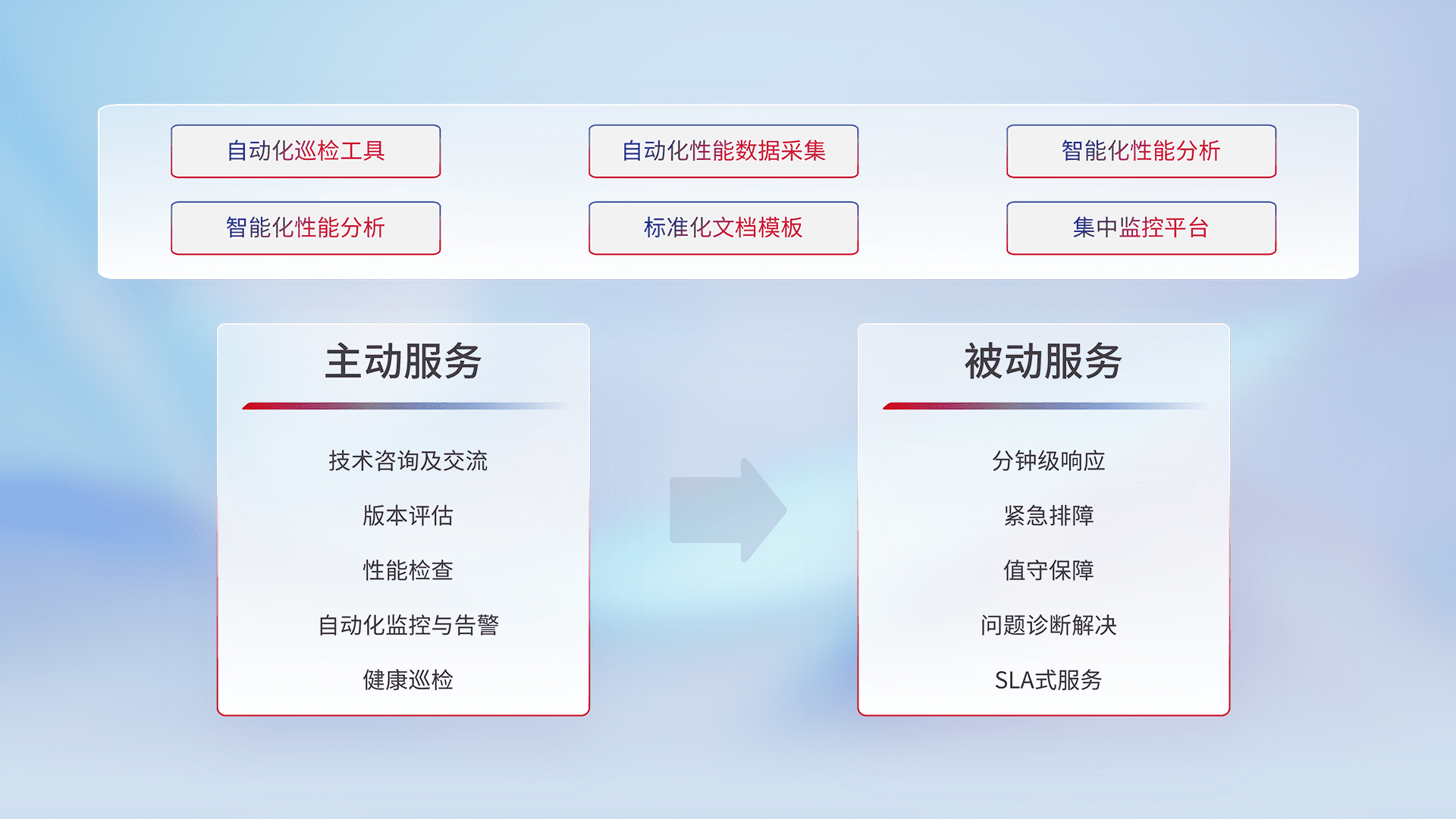 智能化工具和标准化文档,,,保障服务质量,,,提供主动服务(包含技术咨询、、版本评估、、性能检查、、、、自动化监控与告警、、、健康巡检)和被动服务包含(分钟级响应、、、、紧急排障、、、、值守保障、、、问题诊断解决、、、SLA服务)。。。
